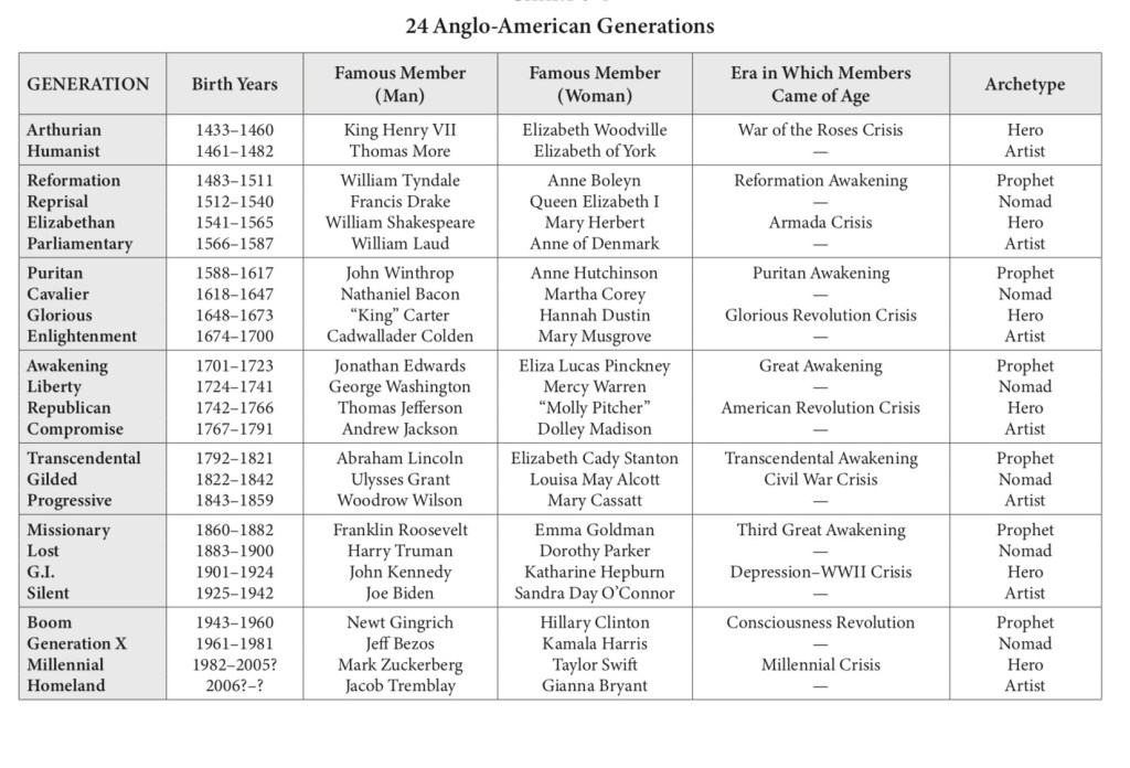 His books “The Accidental Superpower”, “The Absent Superpower”, “Disunited Nations”, and “The End of the World is Just the Beginning” chronicle the Post-WWII position of the USA through the Unraveling and Crisis eras. (not sure Zeihan subscribes to the Strauss-Howe Generational Theory, but the two bodies of work complement each other).